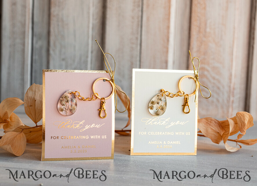 Wedding Favors For Guests in bulk Custom Resin baby breath flower Keychain, Golden personalised Thank you gifts Teardrop Keychain with Gold-Plated Stainless Steel Hardware ( 09/gldkch/fgK )